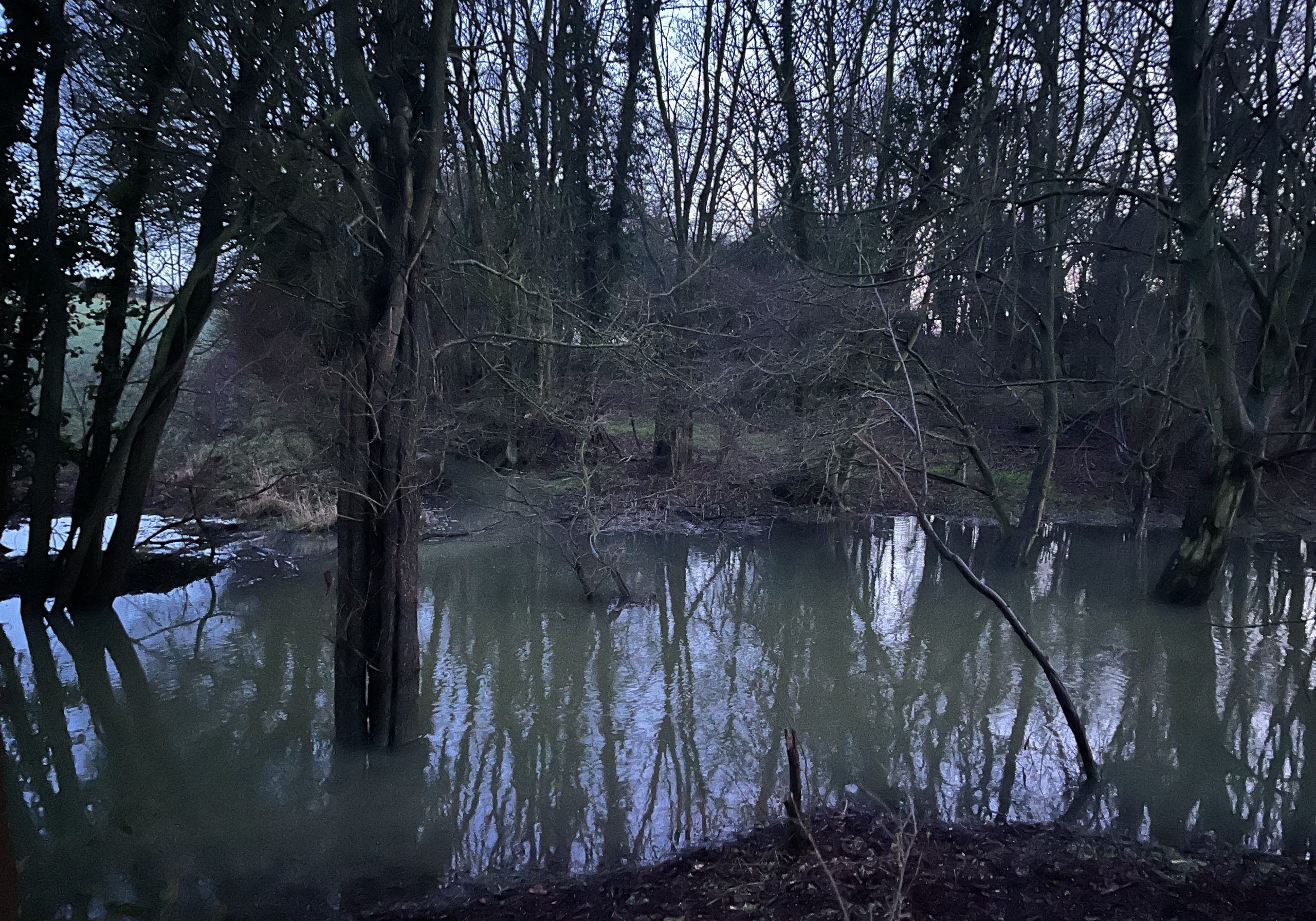 The Common is under water, true wetland once more, and a little beck which was dry and empty only a few months ago has spilled its banks and formed a lake through the woodland where it used to meander. Where the banks narrow it is a brown gurgling spate of a river now.